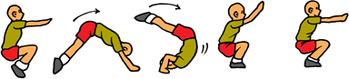 1: voltereta adelante:Partiendo de la posición inicial de cuclillas, con los brazos extendidos al frente impulsarse hacia delante mediante la extensión de las piernas; apoyar las manos sobre la colchoneta llevando la barbilla al pecho y las caderas en alto, apoyar la espalda , rodar sobre ella mediante una posición encorvada, al tiempo que se llevan las rodillas extendidas, seguidamente se flexionan las rodillas, continuando el impulso con el tronco hasta llegar a la posición inicial.